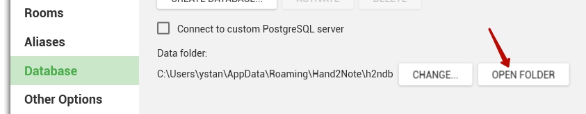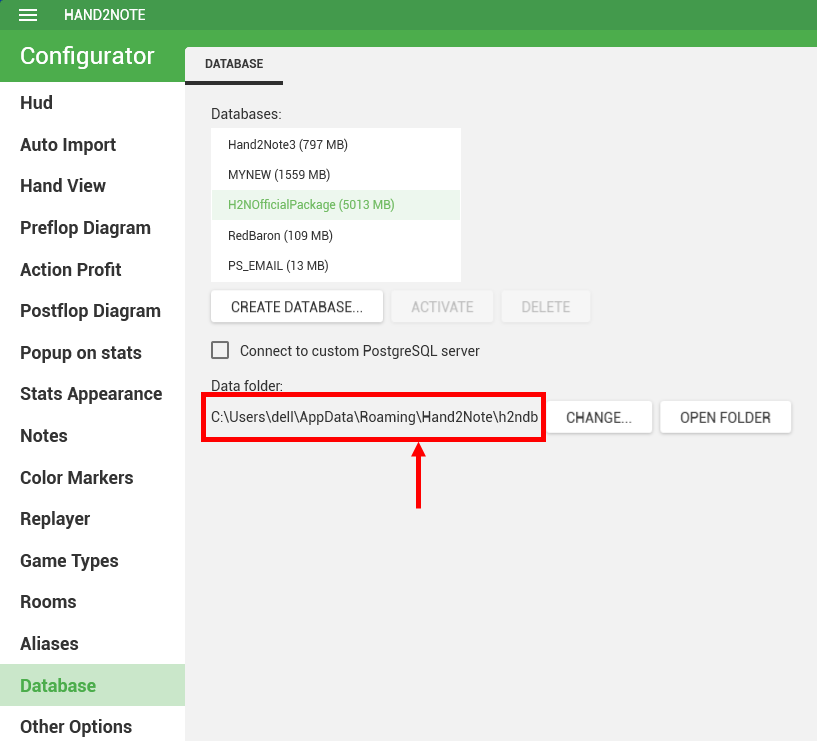 Database is stored by default in C:\Users\<YourUsername>\AppData\Roaming\Hand2Note\h2ndb: