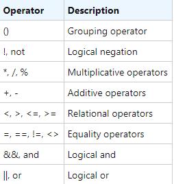 You can use different types of operators in any expression including logical operators(and, not, or). The table below enumerates all of the operators allowed in the grammar, listed in their precedence order. This means that the higher it is in the table, the more priority it will have in the expression evaluation order: